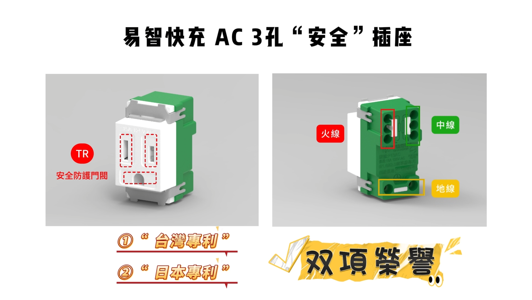 易智快充 AC3 孔安全插座,擁有台灣專利 + 日本專利雙項榮譽,外銷日本備受消費者肯定,接線孔全面升級優化: