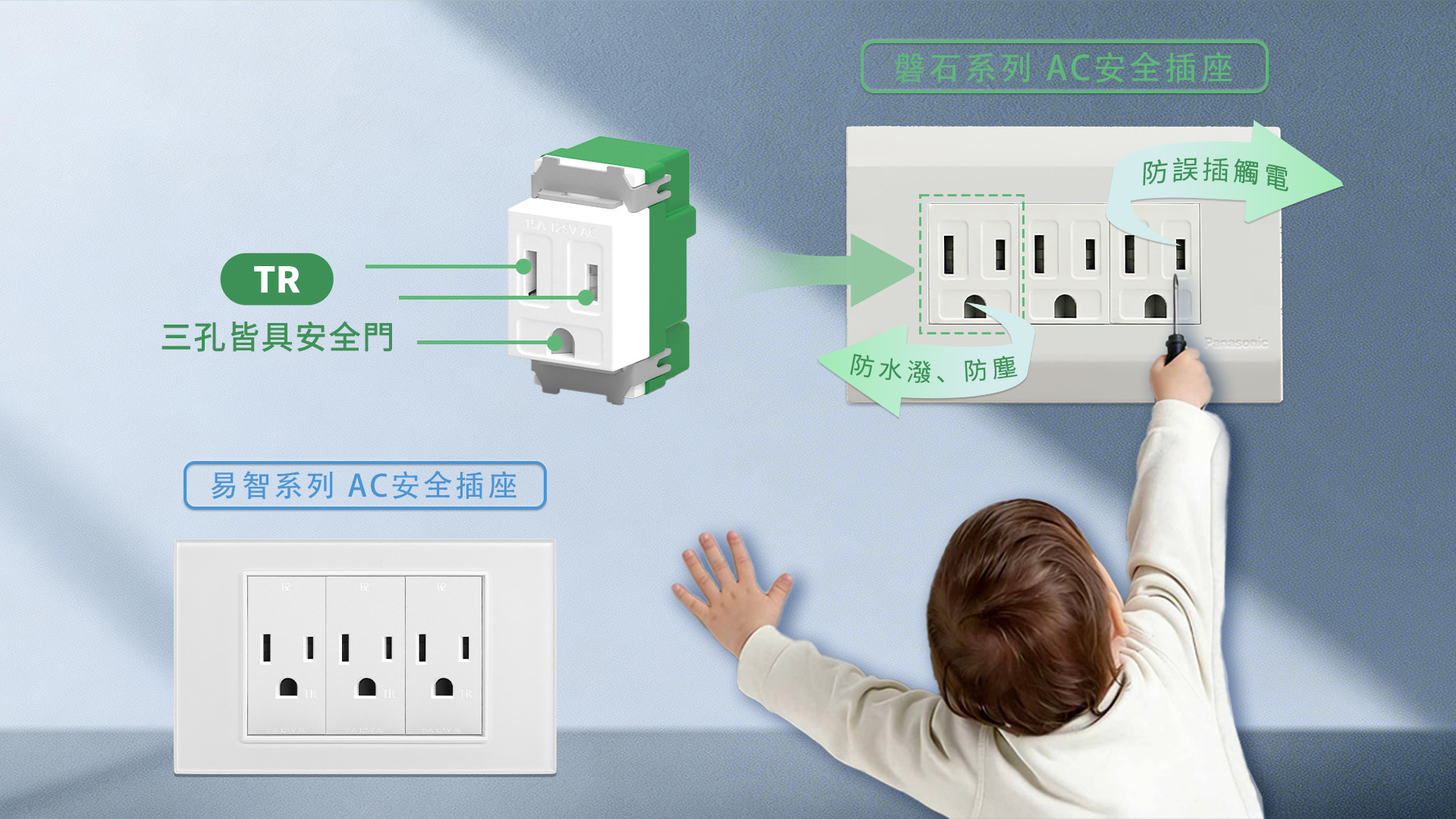 為了家中的孩子安全與生命財產安全的維護,現在就檢視家中的插座,將危險的「一般傳統的AC插座」升級為三孔全具備安全門的“AC安全插座(TR)”;讓它來防護居家安全及阻止意外的發生吧!