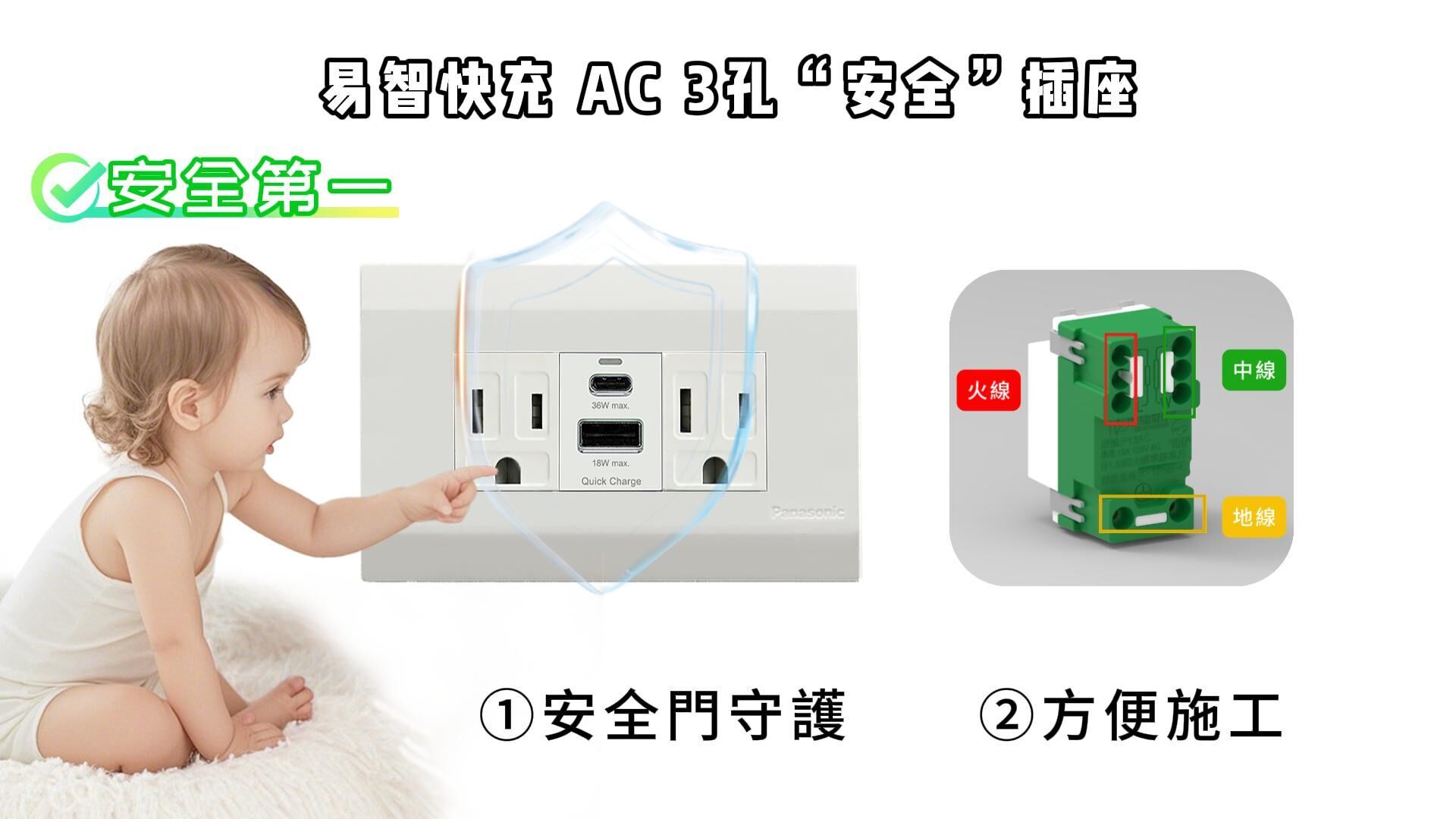 易智快充 AC 3孔 “安全” 插座|台灣家庭用電安全首選,安裝施工超省心 居家生活離不開插座,客廳、臥室、書房到兒童房,AC 插座是家中用量最多、接觸最頻繁的電工面板,它的安全性,直接決定全家的用電安心度! 選錯插座,觸電、漏電、起火等意外隨時可能發生,不僅威脅家人安全,甚至可能讓千萬房產毀於一旦;尤其家中有小朋友的家庭,孩子好奇心強,拿金屬小物件亂插插座、水杯潑灑液體滲入插孔,都是藏在身邊的大隱患,選一款防護到位的安全插座,才是對家人最基本的守護! 市面上多數普通 AC 插座,要麼沒有安全門設計,要麼僅覆蓋火線、中線,地孔完全裸露,防護形同虛設。 易智快充 AC3 孔安全插座,專為家庭安全打造,從防護、價格、安裝到施工,全方面解決台灣家庭的用電煩惱,成為千萬家庭的安心之選!  🔐 全孔安全門防護,從根源杜絕用電風險 別再忽視地孔的安全漏洞! 易智快充做到火線、中線、地孔三孔全配安全門,是市面少見的全孔防護設計 ✅ 堅固防護,杜絕兒童誤插金屬物品引發的觸電意外 ✅ 防塵防水潑,液體無法滲入插孔,徹底避免漏電問題 ✅ 桌面、牆角等易接觸位置放心安裝,再也不用時刻提心吊膽 從源頭堵住用電隱患,讓老人、小孩在家用電更安心! 防兒童誤插觸電:l  每個插孔內部都有獨立的安全保護門。只有插頭的兩個或三個插片同時插入、用力均衡時,保護門才會被推開、接通電源。l  如果只用一根鐵絲、一根手指或任何小物件單孔試探,保護門會保持機械鎖止狀態,完全接觸不到內部帶電部件。防水潑:l  由於插孔在未使用時被絕緣擋板緊密封閉,這客觀上形成了一道物理屏障,能有效阻擋垂直方向或小角度的意外濺水(比如孩子玩水槍、打翻水杯)直接淋入帶電腔體。   💴 小成本升級頂配防護,CP 值直接拉滿 以為高防護的安全插座一定貴?易智快充打破價格刻板印象! 全孔安全門的頂級防護配置,價格卻和市面普通 AC 插座相差無幾,僅需多花一點小錢,就能把家中普通插座升級成三孔全防護的最高等級安全插座,花小錢買大安心,每一分錢都花在家人的安全上,怎麼算都超值!  🛠️ 1/3 小體積設計,台灣家装超適配,安裝零麻煩 換插座怕改裝、怕和家中面板不搭?易智快充替你考慮周全! 採用1/3 小體積模組設計,可靈活搭配國際牌等台灣市面主流品牌面板,無需敲牆、無需改線路,直接替換安裝,幾分鐘就能搞定。 既能借助大品牌面板的質感,提升家中裝修格調,又能享受易智獨家的超強安全防護,實現颜值與安全雙重安心,適合各式家装風格!   📜 台日雙專利加持,施工超省心,佈線整齊不雜亂 普通插座接線孔不足,施工時還要額外購買 3/4/5 通轉接器,不僅增加額外開支,還會導致線材雜亂、擠壓預埋盒,後續維護也麻煩! 易智快充 AC3 孔安全插座,擁有台灣專利 + 日本專利雙項榮譽,外銷日本備受消費者肯定,接線孔全面升級優化: 🔥 火線 3 孔|中線 3 孔|地線 2 孔 可同時連接兩個 1/3 模組,跳線直連無壓力,免用任何轉接器,配線整齊清爽,施工師傅上手快,省時又省力,徹底解決傳統插座的施工難題! 選插座,就是選安心! 易智快充 AC3 孔安全插座,以全孔安全門守護全家用電安全,以台日雙專利設計讓安裝施工零煩惱,價格親民、防護拉滿、适配性強,是台灣家庭的用電安全首選! 選擇易智,就是選擇可靠、安全、放心的家庭用電解決方案,給家人一份無死角的用電安全感,從換一顆好插座開始!  效率提升,水電師傅的輕鬆 易智AC安全插座的這三孔接線設計,其從根本上簡化了佈線結構,並提升了長期可靠性。傳統方式的痛點在於: l  普通插座的火線與零線通常只有一個接線孔。若需從此處引出分支線路,施工人員必須在狹窄的底盒內進行“並線”——即增加一個額外的接線端子(如三通或四通連接器),將多根導線擰緊纏繞,再用絕緣膠布包裹。這種做法不僅使底盒內擁擠雜亂,增加了蓋板安裝的難度,更關鍵的是引入了額外的機械連接點。該連接點日後可能因振動或熱脹冷縮而鬆動,成為電路過熱或間歇性故障的潛在隱患,也給後期檢修排查帶來諸多不便。 易智安全插座的三孔集成設計優勢體現在: l  該產品將火線和零線各自擴展為三個獨立的接線孔,實質上是把分支連接功能直接集成到了插座本體上。施工時,主線接入中間的孔位元,需要跳接的分支線則可直接接入同側富餘的孔位。整個過程無需額外連接器,也省去了並線、纏繞的步驟。 對專業施工而言,這意味著:l  接觸更優:每根導線均由易智插座的獨立螺絲端子直接壓緊,接觸電阻低,連接穩定性高。l  隱患減少:直接取消了底盒內最脆弱的“並線接頭”環節,系統故障概率隨之降低。l  效率提升:省去了製作中間接頭的工序,理線更加清爽,安裝速度顯著加快。l  維護直觀:打開面板,所有線路的連接關係一目了然,極大方便了後續的檢修與排查。 這正是我們研發易智AC安全插座時,最想為師傅們解決的實際問題。傳統插座只有一個接線孔,跳線時必須額外加裝連接器,不僅費時費料,還增加了鬆動和發熱的隱患。我們之所以堅持設計“火零各三孔”,就是為了讓接線回歸簡單、讓連接更加可靠。。 ✅ 免去中間接頭,減少故障點✅ 接線一步到位,省時省料✅ 線路清晰易查,後期維護輕鬆  我們相信,好的產品應該讓人更輕鬆,而不是更複雜。易智AC安全