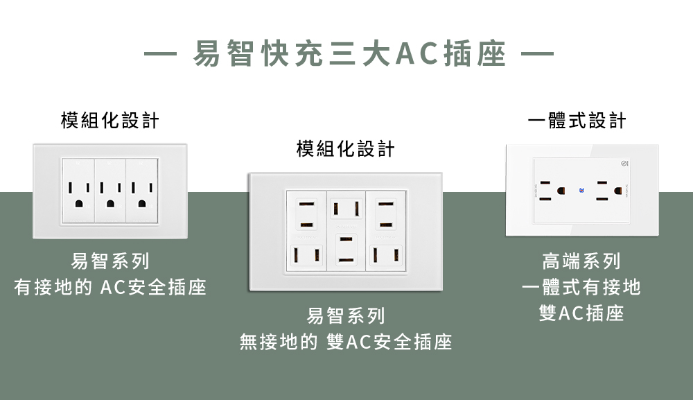 一、三種插座的特色與選擇建議易智快充的 AC 插座主要分為模組化設計的系列,以及一體式設計的高端系列。  易智 附接地AC安全插座(TR)​ 1. 特色與詳情: 此類型插座採用模組化設計,可彈性組合。 具備接地線設計,插線即可使用,方便簡單。火線孔、中線孔、地線孔三孔皆具安全門防護有了安全門的防護,便可防止兒童誤插觸電, 更可防水潑及灰塵入侵而產生的意外! ※ 榮獲台、日的創新專利,安全有保障  2. 選擇與應用建議: ● 此插座適用於大型家電,例如冰箱、電鍋及洗衣機等。 ● 由於具備接地線設計,能有效保障用電安全。 ● 在客廳或浴室等需要連接多樣電器的區域,可以選擇將此有接地的 AC 插座與無接地的雙 AC 插座進行組合使用。  雙 AC 安全插座(無接地) 1. 特色與詳情: ● 此為易智獨家專利設計,在傳統 AC 插座基礎上實現了雙 AC 插座的突破。 ● 在同樣的空間內設置了兩個 AC 插孔,兼具美觀實用。 ● 背後接線更為便利:每一火線或中線皆有三孔連接,可以當作中繼連接,無需額外的接線器。 ● 面板有單連和雙連兩種款式,其中雙連面板最多可提供 12 個插座,讓多個設備同時使用。 ● 與其他類型一樣,前方的每一個插孔皆設有防觸電安全門。 ● 此類型插座採用模組化設計,可彈性組合。● 每個AC插孔皆具有安全門,防止兒童誤觸電,防塵、防水潑 2. 選擇與應用建議: ● 此設計有效解決了插座不足的困擾。您無需因插孔不足而安裝不安全、不美觀且不方便的轉接頭或延長線插座,大幅提高了用電安全性。 ● 適合在需要多個插孔的場所使用。 ● 例如,臥室可以選擇此雙 AC 插座與開關及 USB 的組合,為小夜燈、手機、平板等同時充電。 ● 在客廳牆或浴室,也建議將此雙 AC 插座與有接地的 AC 插座組合使用,以滿足電視、路由器、風扇、吸塵器、電動牙刷、美容導入儀等各種電器的需求。   高端一體式AC插座(附接地)​​ 1. 特色與詳情: ● 此系列為一體式設計,安裝方便。 ● 具備更廣泛的接線方式,無論是2.0mm單芯線還是5.5mm多芯線,都能輕鬆應對,滿足不同的接線需求。 ● 連線簡單,只需連接火線、中線、地線三條即可,方便消費者自己 DIY 安裝。 ● 具備插座安全閥的設計,安全性能出色。 ● 此插座是全台唯一通過 UL 安規認證的 AC 插座,亦獲得台灣 BSMI 認證和 RoHS 環保認證。  2. 選擇與應用建議: ● 此類型插座因其品質與安全認證,也是公共建設之首選。 ● 適用於追求最高品質、最安全性能,且需要處理單銅線或多銅線接線需求的場所。 二、三種插座特色比較表特色有接地AC安全插座雙 AC 安全插座(無接地)高端一體式AC插座(附接地)設計結構模組化設計可彈性搭配其他模組模組化設計可彈性搭配其他模組一體式設計接地線有無有AC 插孔數量單 AC 插座雙 AC 插座 (在同樣空間內)雙 AC 插座 (一體式)AC 插孔安全門有有無主要功能保障大型家電用電安全解決插座不足,無需轉接頭品質安全保證,接線方式廣泛接線方式火線、中線各三孔設計,無需額外接線器即即可中繼連接火線、中線各三孔設計,無需額外接線器即即可中繼連接鎖孔式接線適用電壓110V110V110V適用線徑2.0mm單芯線2.0mm單芯線2.0mm單芯線/5.5mm多芯線適用情境冰箱、電鍋、洗衣機等附接地插頭大型家電客廳、浴室、臥室等小型家電(搭配 USB/開關)公共建設、電機工程,追求極致安全品質特殊認證台灣BSMI, RoHS台灣BSMI, RoHS全台唯一通過 UL 安規認證,BSMI, RoHS 易智快充:為安全把關符合國際與台灣安全規範易智快充全系列產品通過台灣BSMI認證,同時也符合PSE、TÜV、UL等國際安全認證,確保產品的安全性與可靠性。多重安全保護機制產品內建過載保護、短路保護等功能,能有效預防電氣火災,保障使用者安全。智能設計,提升便利性除了安全性,易智快充還具備智能快充功能,支援多種設備快速充電,讓生活更便利的同時,也確保用電安全。適用於各種場景無論是家庭、辦公室還是公共場所,易智快充有多種系列可供選擇,都能提供穩定的電力支援,並通過嚴格的安全測試,適合廣泛應用。 立即下單,開啟快速充電新生活!讓易智快充成為你生活中的高效助手,充電快一點,生活更輕鬆!