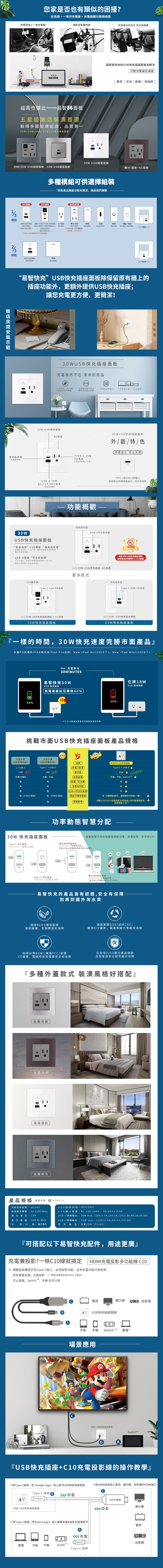 快速充電:30W USB(C+A)雙接口,支援快速充電,兼容智能手機、平板設備,USB-A正反插設計,隨心插拔