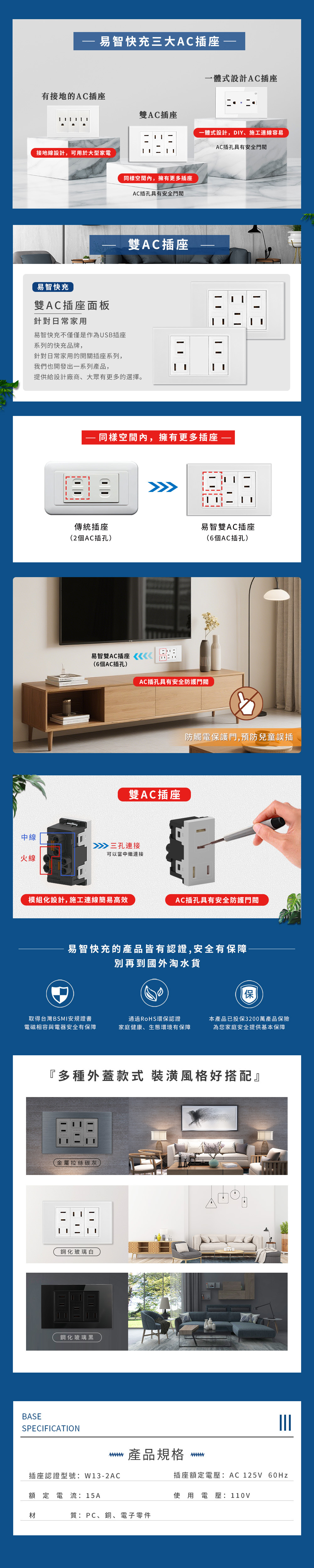 獨家設計:AC插孔具有安全防護門發,防水潑,防兒童誤插觸電