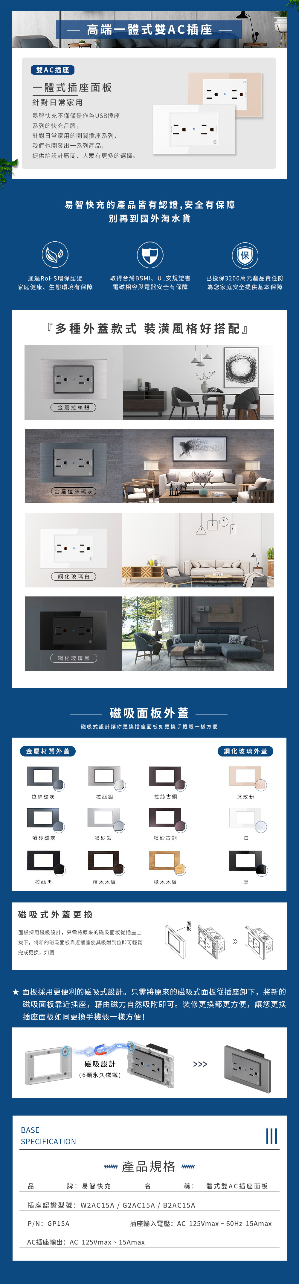 木紋質感磁吸面板|AC插座|輕鬆配線DIY|防兒童誤觸|台灣及國際安全認證|易智快充