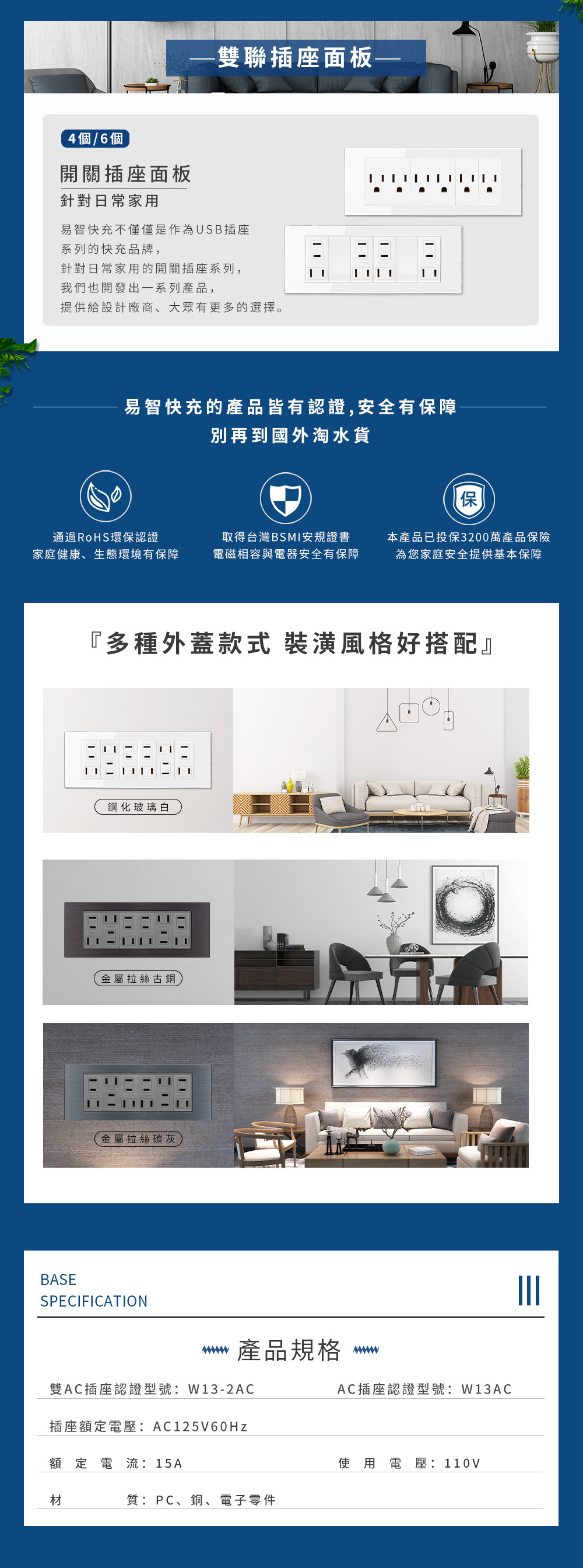 金屬質感正方形雙聯面板|雙AC插座|AC插座|台灣及國際安全認證|易智快充